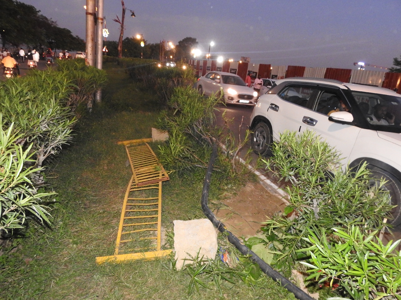 नौकायन रोड तारामंडल में गाड़ी की ठोकर से क्षतिग्रस्त डिवाईडर पर बना रेलींग। जागरण