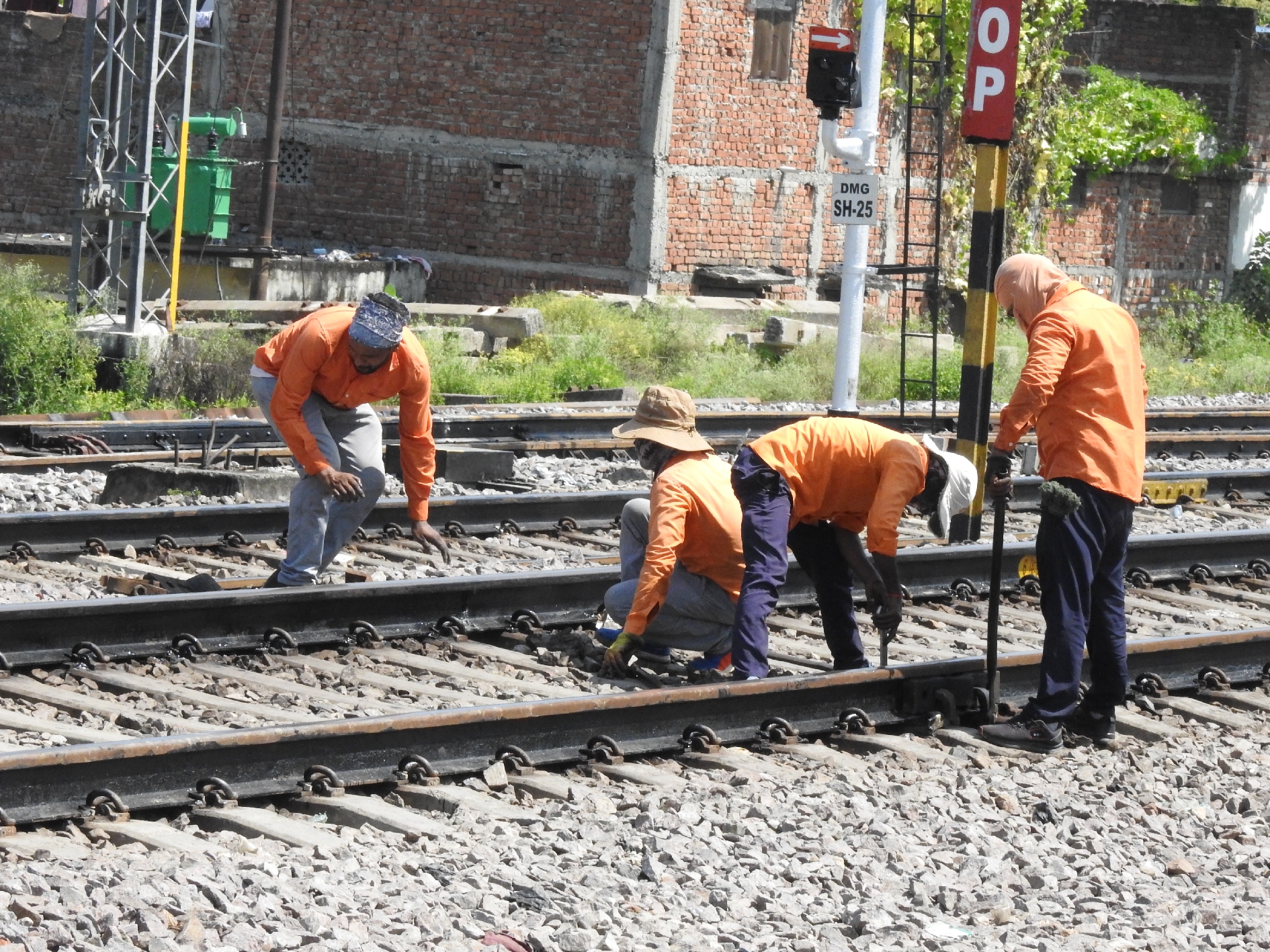 डोमिनगढ़ में रेल लाइन को ठीक करते रेलकर्मी। जागरण