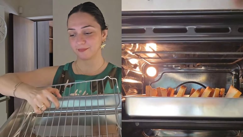 She opened a pack of bread, placed the slices in the rack sections, popped it straight into the oven, and voila - perfectly toasted bread for everyone at once. Simple, smart, and time-saving. She ended the video with a cheeky, "Thank me later," and honestly, we all should. The side note read, "Geeneee-assss!!"