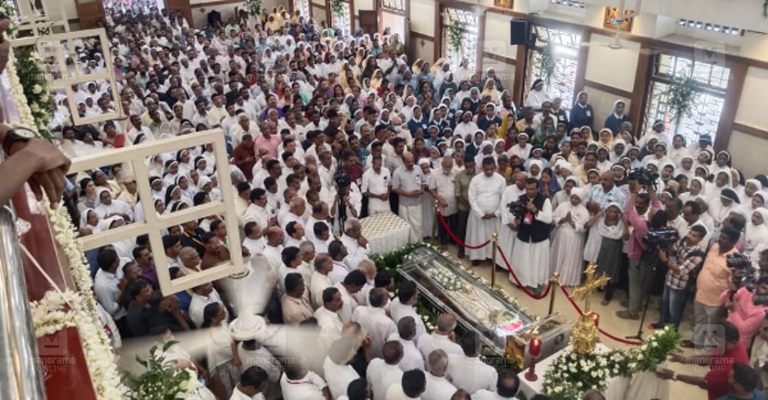 കോഴിക്കോട് കോട്ടുളിയിലെ ‘ഹോം ഓഫ് ലവ്’ ജനറലേറ്റിൽ തൃശൂർ അതിരൂപത മുൻ അധ്യക്ഷൻ ആർച്ച് ബിഷപ് ഇമെരിറ്റസ് മാർ ജേക്കബ് തൂങ്കുഴിയുടെ സംസ്കാരശുശ്രൂഷയിൽ പങ്കെടുക്കുന്ന ക്രിസ്തുദാസി സന്യാസി സമൂഹത്തിലെ അംഗങ്ങൾ. ചിത്രം: എം.ടി.വിധുരാജ്/മനോരമ