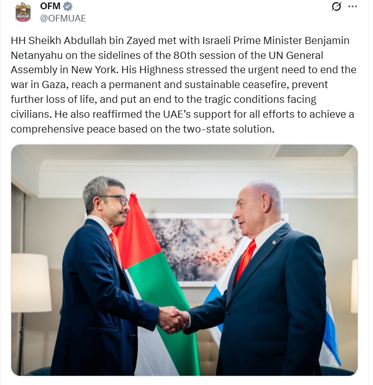 पोस्ट में यह भी कहा गया कि उन्होंने “टू-स्टेट सॉल्यूशन पर आधारित व्यापक शांति प्राप्त करने के सभी प्रयासों के लिए यूएई के समर्थन की पुष्टि की“।
