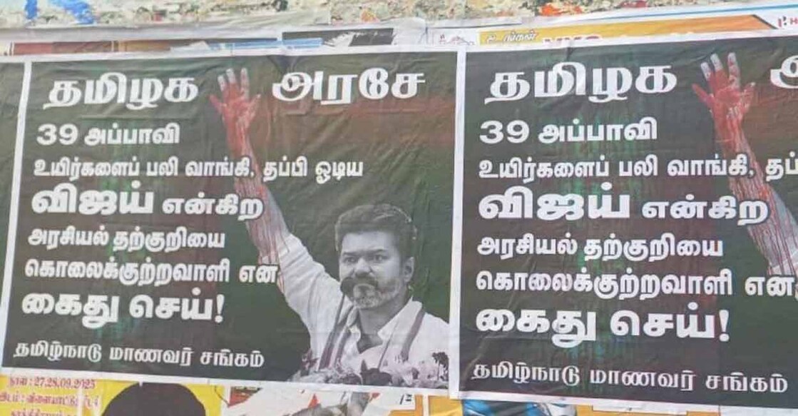 ‘കൊലപാതകി, അറസ്റ്റ് ചെയ്യണം’: ചോര പുരണ്ട കൈകളുമായി വിജയ്; കരൂരിൽ നടനെതിരെ പോസ്റ്റർ_deltin51