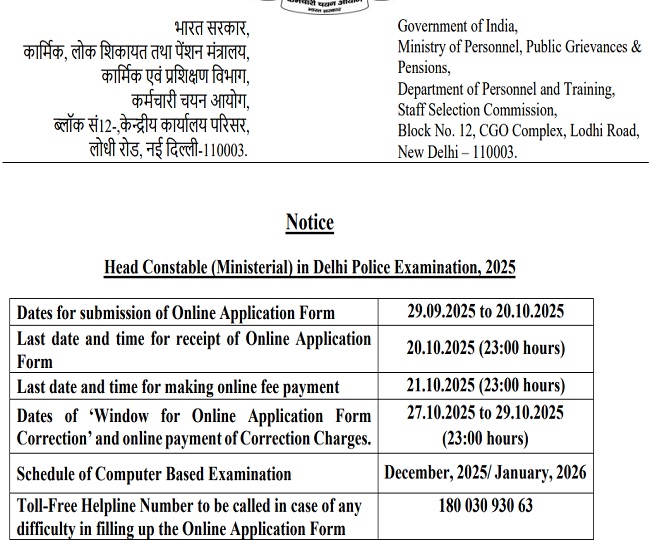 जॉब डेस्क, नई दिल्ली। दिल्ली पुलिस भर्ती की तैयारी कर रहे युवाओं के लिए बड़ी खबर है। स्टाफ सिलेक्शन कमीशन (SSC) की ओर से हेड कॉन्स्टेबल (मिनिस्ट्रियल) भर्ती के लिए नोटिफिकेशन जारी कर आवेदन प्रक्रिया स्टार्ट कर दी है। इच्छुक एवं योग्य अभ्यर्थी इस भर्ती में भाग लेने के लिए ऑनलाइन माध्यम से एसएससी की ऑफिशियल वेबसाइट ssc.gov.in पर जाकर आवेदन प्रक्रिया पूर्ण कर सकते हैं। एप्लीकेशन फॉर्म भरने की लास्ट डेट 20 अक्टूबर एवं फीस जमा करने की अंतिम तिथि 21 अक्टूबर 2025 निर्धारित है। विज्ञापन हटाएं सिर्फ खबर पढ़ें