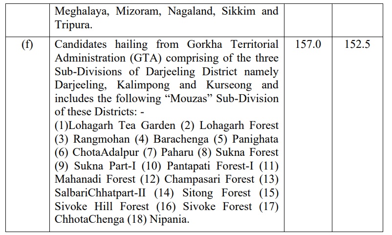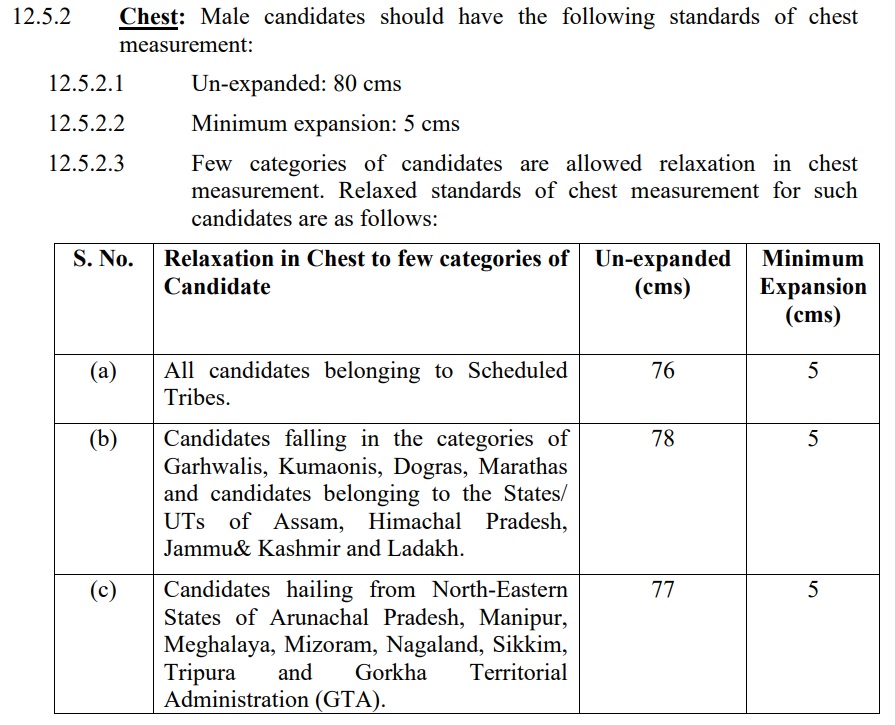 इस भर्ती में शामिल होने के लिए पुरुष उम्मीदवारों की न्यूनतम लंबाई 170 cms और महिला उम्मीदवारों की ऊंचाई 157 cms होनी चाहिए। आरक्षित वर्ग/ क्षेत्र से आने वाले उम्मीदवारों को नियमानुसार छूट दी गई है। वर्ग के अनुसार लंबाई एवं चेस्ट माप की डिटेल नीचे इमेज से चेक कर सकते हैं।