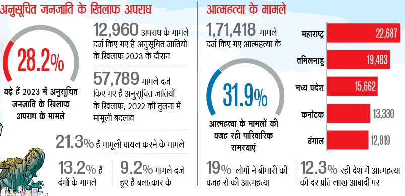जेएनएन, नई दिल्ली। भारत में अनुसूचित जनजाति (ST) के खिलाफ अपराध के मामलों में बड़ा इजाफा दर्ज किया गया है। राष्ट्रीय अपराध रिकॉर्ड ब्यूरो (NCRB) के ताजा आंकड़ों के अनुसार 2023 में अनुसूचित जनजाति के खिलाफ अपराध के मामलों में 28 प्रतिशत की वृद्धि हुई है। समान अवधि में देश में आपराधिक गतिविधियों में 2022 की तुलना में 7.2 प्रतिशत का इजाफा दर्ज किया गया है। वहीं, बच्चों के खिलाफ अपराध के मामले भी करीब 9 प्रतिशत बढ़े हैं। विज्ञापन हटाएं सिर्फ खबर पढ़ें