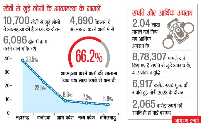 खेती से जुड़े लोगों के आत्महत्या के मामले भी सामने आए हैं। 2023 में 10,700 खेती से जुड़े लोगों ने आत्महत्या की, जिनमें 4690 किसान थे और 6,096 खेतों में काम करने वाले श्रमिक थे।