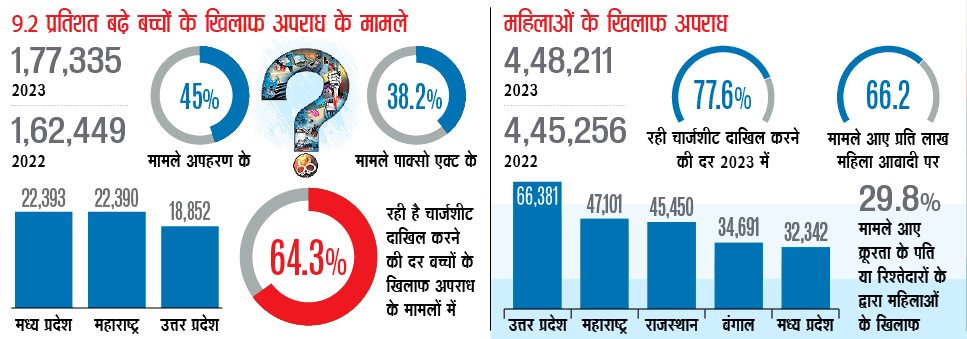 NCRB के आंकड़ों के अनुसार, 2022 में बच्चों के खिलाफ अपराध के 1,62,449 मामले दर्ज किए गए थे, जो 2023 में बढ़कर 1,77,335 हो गए। इनमें 45 प्रतिशत अपहरण और 38.2 प्रतिशत पॉक्सो अधिनियम के तहत मामले दर्ज किए गए हैं। बच्चों के खिलाफ सबसे अधिक आपराधिक मामले मध्य प्रदेश से सामने आए हैं। इस लिस्ट में महाराष्ट्र दूसरे और उत्तर प्रदेश तीसरे स्थान पर है।