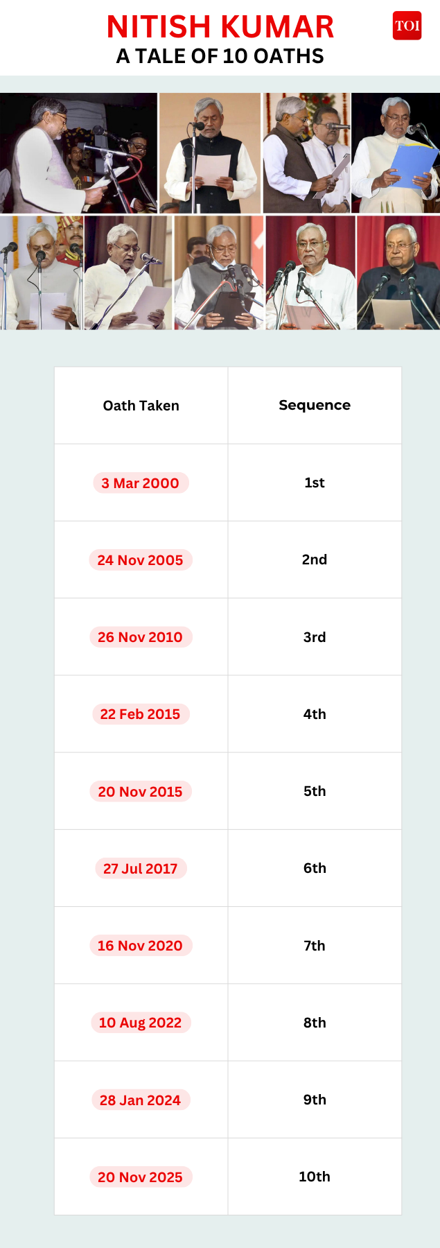 NEW DELHI: Phir ek baar Nitish Kumar. Bihar, once again, has sealed its political future in the hands of a man who has ruled it for most of the past two decades -- a leader who has mastered the art of survival, reinvention, and political engineering like no one else in modern politics. With a thunderous NDA majority of 202 seats, the state has handed Nitish Kumar his 10th chief ministerial term, an extraordinary milestone he reached on November 20, 2025.The relentless, "nirantar" Nitish Kumar has once again emerged victorious, this time an easy way -- a testament to his reputation as an "all-weather politician". At 74, he continues to wield influence with remarkable ease, comfortably reaffirming his place at the centre of the state’s politics.