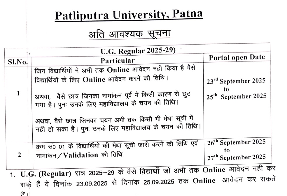 एजुकेशन डेस्क, नई दिल्ली। पाटलिपुत्र यूनिवर्सिटी के अंडर ग्रेजुएट कोर्स में एडमिशन लेने की सोच रहे छात्रों के बड़ी खबर है। विश्वविद्यालय की ओर से विभिन्न यूजी पाठ्यक्रमों में एडमिशन के लिए ऑनलाइन आवेदन प्रक्रिया आज यानी 23 सितंबर से स्टार्ट कर दी गई है जो 25 सितंबर 2025 तक जारी रहेगी। ऐसे स्टूडेंट्स जिन्होंने अभी तक दाखिले के लिए आवेदन नहीं किया था या पहले किसी कारणवश फॉर्म छूट गया था अथवा जिन छात्रों को पहले सीट अलॉट नहीं हुई थी वे तय तिथियों के अंदर आवेदन प्रक्रिया पूर्ण कर सकते हैं। विज्ञापन हटाएं सिर्फ खबर पढ़ें