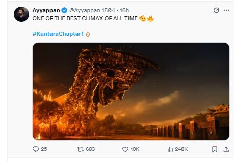 फिल्म देखकर आए एक और यूजर ने लिखा, “कांतारा चैप्टर 1 ब्लॉकबस्टर फिल्म है, खास तौर पर सेकंड हाफ में मैडनेस अपनी पीक पर है। ऋषभ शेट्टी एक अलग ही लेवल एक्टर हैं“। ये सभी के लिए एक सिनेमैटिक अनुभव है“।