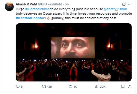 अब इसके प्रीक्वल \“कांतारा चैप्टर 1\“ देखकर निकले एक यूजर ने एक्स अकाउंट पर लिखा, “मैं होम्बले फिल्म्स से ये गुजारिश करता हूं कि जो आपसे हो सके इस फिल्म के लिए वह कीजिये, क्योंकि ऋषभ शेट्टी इस बार ऑस्कर जीतना डिजर्व करते हैं। आप इसे ग्लोबल लेवल पर ले जाने के लिए कुछ भी कीजिये“।