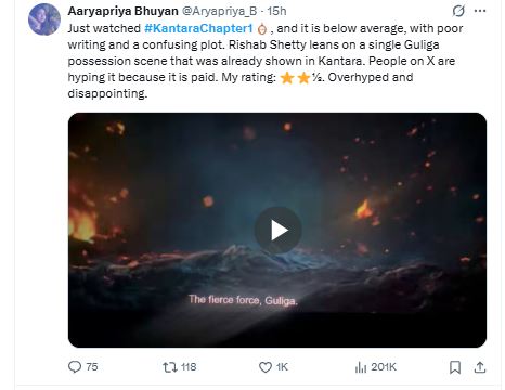 कुछ यूजर्स ने फिल्म की कहानी को वीक भी बताया है। एक अन्य यूजर ने लिखा, “मैंने अभी-अभी कांतारा चैप्टर 1 देखी है और इस फिल्म की राइटिंग बहुत ही खराब लिखी गई है और प्लॉट बहुत ही कन्फयूजिंग है। पजेशन सीन इससे पहले कांतारा में भी दिखाया गया था। लोग इसे जबरदस्ती हाइप कर रहे हैं“।