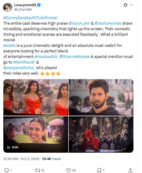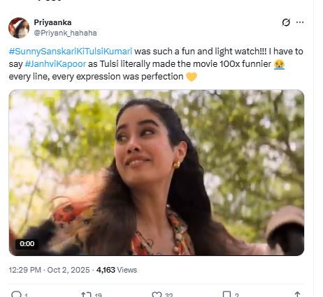 जाह्नवी कपूर की तारीफ करते हुए एक और यूजर ने लिखा, “सनी संस्कारी की तुलसी कुमारी एक लाइट और मजेदार फिल्म है। मैं ये कहना चाहता हूं कि जाह्नवी कपूर ने तुलसी बनकर फिल्म को 100 परसेंट फनी बनाया है। हर लाइन हर एक्सप्रेशन परफेक्ट था“।