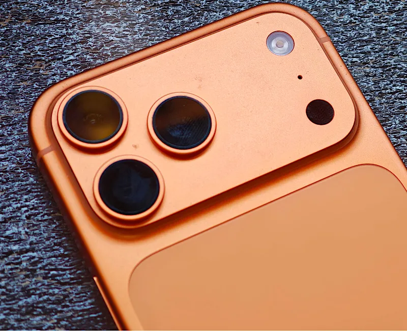 Cosmic Orange Apple’s seasonal colours are often pleasant footnotes; Cosmic Orange is a minor event. In person, it is less neon and more deep, glassy amber, like light passing through honeyed resin. Under bright sun it blooms into a vivid, almost saffron-tinted flame, catching the curves of the camera plateau and the chamfers with a warm highlight that photographs beautifully. Indoors, it relaxes into a richer, burnt-copper tone that looks tailored with graphite accessories and surprisingly grown-up next to silver or black.