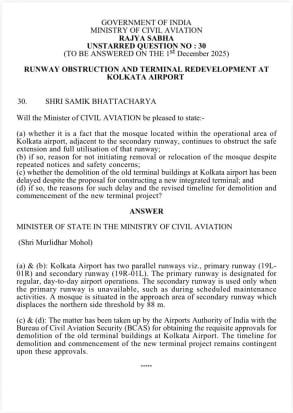 In his question, the MP asked if it is a fact that the mosque located within the operational area of Kolkataairport, adjacent to the secondary runway, continues to obstruct the safe extension and full utilisation of that runway.