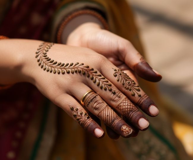 अगर आपको बहुत भरी हुई या बारीक मेहंदी पसंद नहीं, तो सिर्फ उंगलियों पर बेल वाला डिजाइन बना सकती हैं। यह डिजाइन आपके हाथों को एक बेहद ही एलिगेंट और सिंपल लुक देगी। इसमें आप हर उंगली पर अलग-अलग बारीक डिजाइन बना सकती हैं। जैसे, एक उंगली पर पत्तियां वाली बेल, दूसरी पर छोटे-छोटे फूल और तीसरी पर सिर्फ बारीक डॉट्स। यह डिजाइन उन लोगों के लिए बिल्कुल सही है जो कम से कम मेहंदी लगाना पसंद करते हैं।