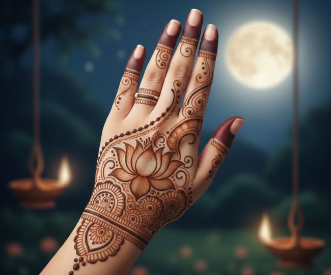 कमल का फूल भारत में पवित्रता, सुंदरता और आध्यात्मिक जागृति का प्रतीक माना जाता है। इस मेहंदी डिजाइन में आप अपनी हथेली के एक कोने में एक खूबसूरत कमल का फूल बना सकती हैं। कमल के आस-पास आप लहरदार लाइनों या गोल शेप का डिजाइन बना सकती हैं जो इसे और भी आकर्षक बनाएगा। यह डिजाइन देखने में बेहद पीसफुल और अट्रैक्टिव लगता है और शरद पूर्णिमा के शांत और पवित्र माहौल से मेल भी खाता है।