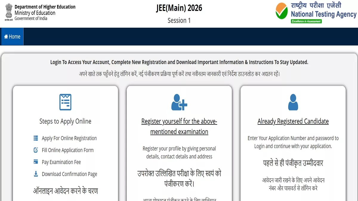 - वेबसाइट के होम पेज पर आपको LATEST NEWS में Online Application Form for JEE (Main) – 2026 Session-1 पर क्लिक करना होगा।