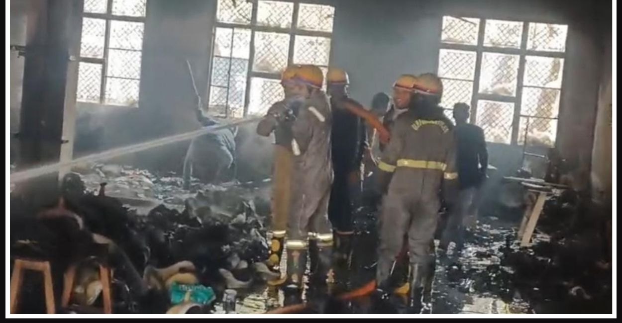 सोहनलाल कंपाउंड स्थित सैडलरी कारखाने में लगी आग बुझाते दमकल के जवान। अग्निशमन विभाग