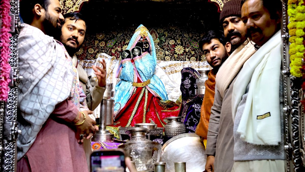 आराध्य के दर्शन को मंदिर में हजारों भक्तों की भीड़ के जयकारे गूंज रहे हैं। मंगलवार की सुबह जब मंदिर के पट खुले तो ठाकुरजी बर्तन विक्रेता के रूप में भक्तों को दर्शन दे रहे थे। भोर में घने कोहरे को चीरते हुए ठिठुरनभरी सर्दी में देश के विभिन्न प्रांतों से वृंदावन में डेरा डाले श्रद्धालु मंदिर में चल रहे खिचड़ी उत्सव में ठाकुरजी को दिव्य दर्शन करने को पहुंचने लगे।