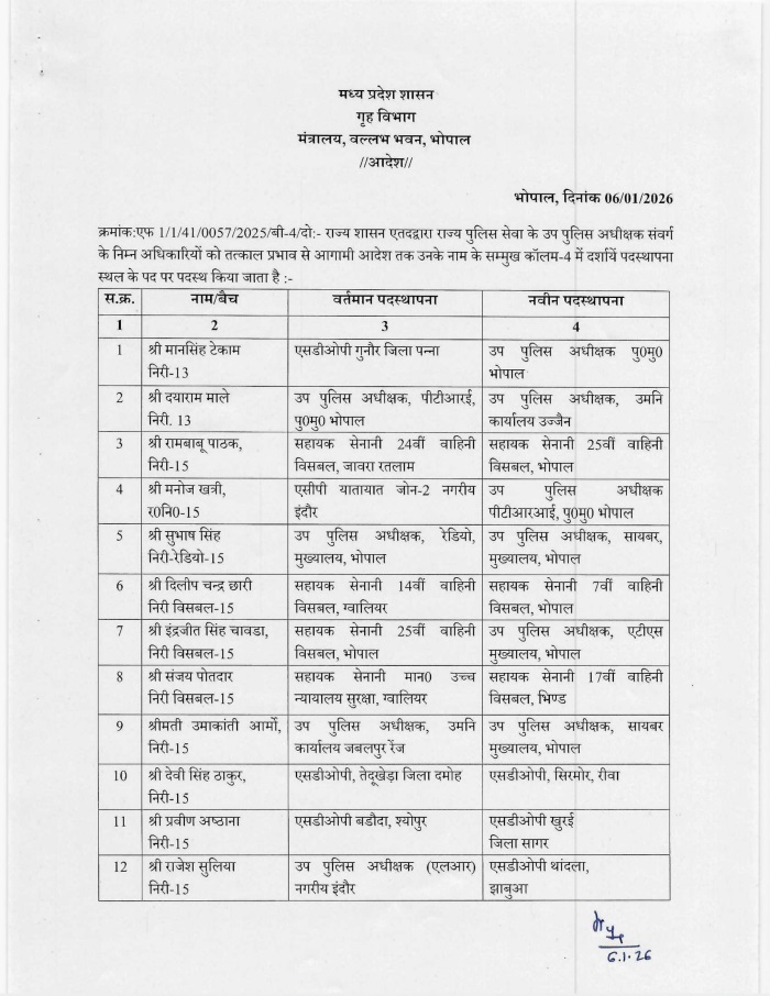 डिजिटल डेस्क, भोपाल। नए साल के पहले सप्ताह में ही मध्य प्रदेश सरकार ने पुलिस विभाग में व्यापक प्रशासनिक बदलाव किया है। गृह विभाग ने मंगलवार को राज्य पुलिस सेवा के 64 उप पुलिस अधीक्षकों (DSP) के तबादला आदेश जारी किए। इस बड़े फेरबदल में करीब एक दर्जन अधिकारियों को फील्ड पोस्टिंग से हटाकर पुलिस मुख्यालय (PHQ) और अन्य प्रशिक्षण व विशेष इकाइयों में पदस्थ किया गया है।