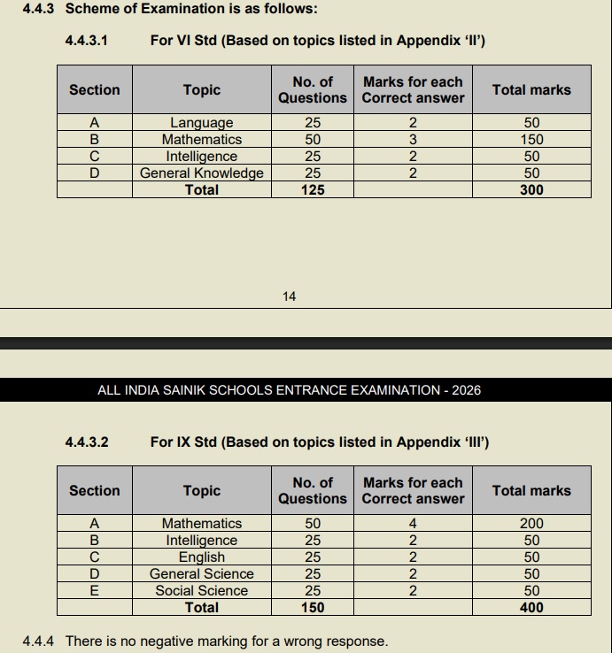 सैनिक स्कूल कक्षा 6वीं के लिए छात्रों से 125 बहुविकल्पीय प्रकार के प्रश्न पूछे जायेंगे। प्रश्न पत्र हल करने के लिए छात्रों को 2:30 घंटे यानी 150 मिनट का समय दिया जायेगा। टाइमिंग अपरान्ह 2 से 4:30 तक रहेगी। इसके अलावा कक्षा 9वीं के लिए छात्रों से 150 बहुविकल्पीय प्रकार के प्रश्न पूछे जायेंगे। पेपर हल करने के लिए 3 घंटे यानी 180 मिनट का समय मिलेगा। टाइमिंग अपरान्ह 2 से शाम 5 बजे तक रहेगी।