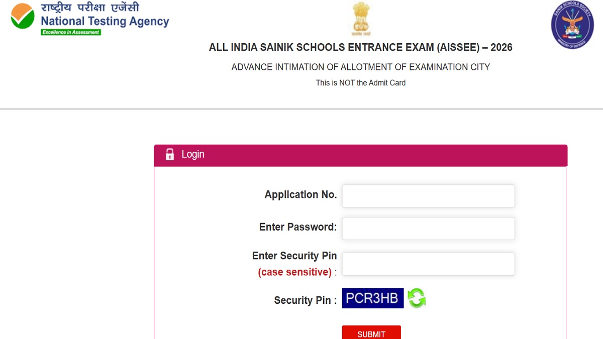एजुकेशन डेस्क, नई दिल्ली। ऑल इंडिया सैनिक स्कूल एंट्रेस एग्जाम (AISSEE 2026) के लिए आवेदन करने वाले छात्रों के लिए एग्जाम सिटी स्लिप (Sainik School Exam City Slip) डाउनलोड के लिए उपलब्ध करवा दी गई है। स्टूडेंट्स या उनके माता-पिता तुरंत ही सिटी स्लिप नेशनल टेस्टिंग एजेंसी (NTA) की ऑफिशियल वेबसाइट exams.nta.nic.in पर जाकर या इस पेज पर दिए डायरेक्ट लिंक से डाउनलोड कर सकते हैं। सिटी स्लिप डाउनलोड करने के लिए आपको एप्लीकेशन नंबर, पासवर्ड दर्ज करना होगा।