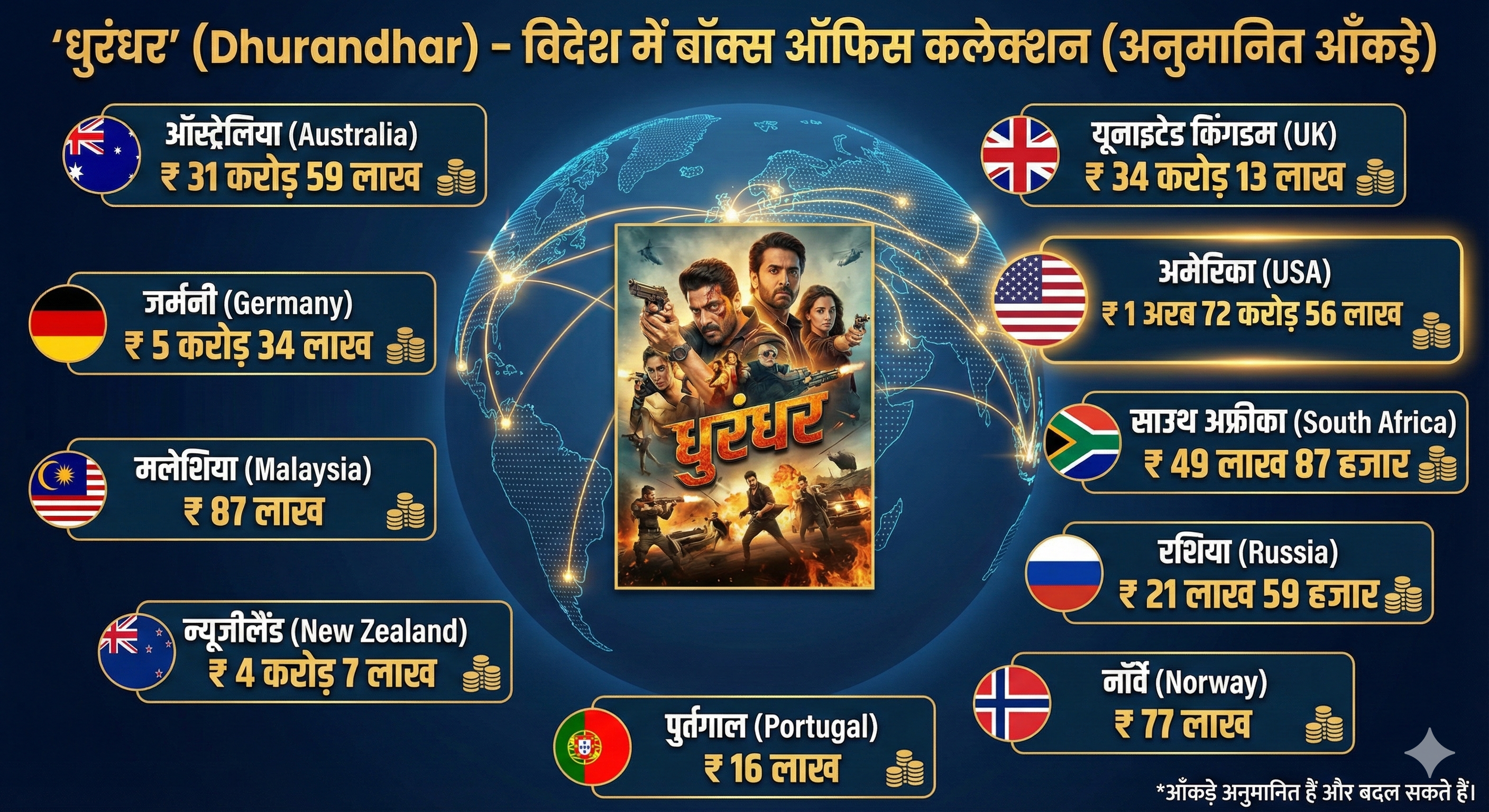 33 दिन पहले 5 दिसंबर को दुनियाभर के सिनेमाघरों में रिलीज हुई फिल्म \“धुरंधर\“ दंगल के बाद दुनियाभर में हिंदी सिनेमा की दूसरी सबसे ज्यादा कमाई करने वाली मूवी बन चुकी है। स्पाई थ्रिलर फिल्म को विदेशों में ऑस्ट्रेलिया से लेकर जर्मनी, मलेशिया, न्यूजीलैंड, नॉर्वे, पुर्तगाल, रशिया, साउथ अफ्रीका, यूनाइटेड किंगडम और अमेरिका में रिलीज किया गया था। फॉरेन कंट्रीज में धुरंधर ने अभी तक कितने कमाए, नीचे देखें हर डिटेल: