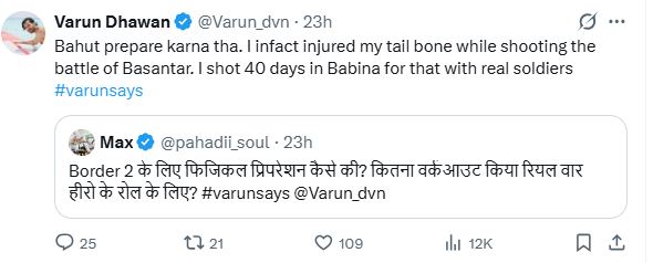 जब एक फैन ने उनसे बॉर्डर 2 के लिए की गई तैयारियों के बारे में पूछा, तो वरुण धवन ने जवाब देते हुए कहा, “फिल्म के लिए बहुत तैयारी करनी पड़ी थी। युद्ध की शूटिंग करते समय मैं अपनी टेल बोन भी चोटिल कर बैठा था। उसके लिए मैंने बबीना में असली सैनिकों से साथ 40 दिनों तक शूटिंग की।“