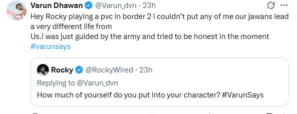 जब एक फैन ने वरुण धवन से ये पूछा कि वह अपना किरदार निभाते हुए खुद का कितना इनपुट उसमें डालते हैं? तो वरुण धवन ने जवाब देते हुए कहा, “बॉर्डर 2 में पीवीसी प्ले करते हुए मैं अपना ज्यादा कुछ नहीं दिखा सकता था, क्योंकि हमारे जवान हमसे बहुत अलग जिंदगी जीते हैं। मुझे आर्मी ऑफिसर्स की तरफ से जो भी गाइडेंस मिली, मैंने उसे उस पल में ईमानदारी से निभाने की कोशिश की।“