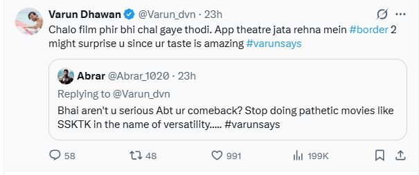 बॉर्डर 2 की रिलीज से पहले वरुण धवन ने उन फैंस को भी प्यार से जवाब दिया, जो उन्हें क्रिटिसाइज करते हैं। एक फैन ने लिखा, “भाई क्या आप अपने कमबैक को लेकर सीरियस नहीं हैं? सनी संस्कारी की तुलसी कुमार जैसी घटिया फिल्में मत कीजिए वर्सेटिलिटी के नाम पर। इसके जवाब में वरुण धवन ने कहा, “चलो फिर भी फिल्म चल गई थोड़ा। आप थिएटर में जाते रहना। बॉर्डर 2 शायद आपको हैरान कर दे, क्योंकि आपका टेस्ट अमेजिंग है।“
