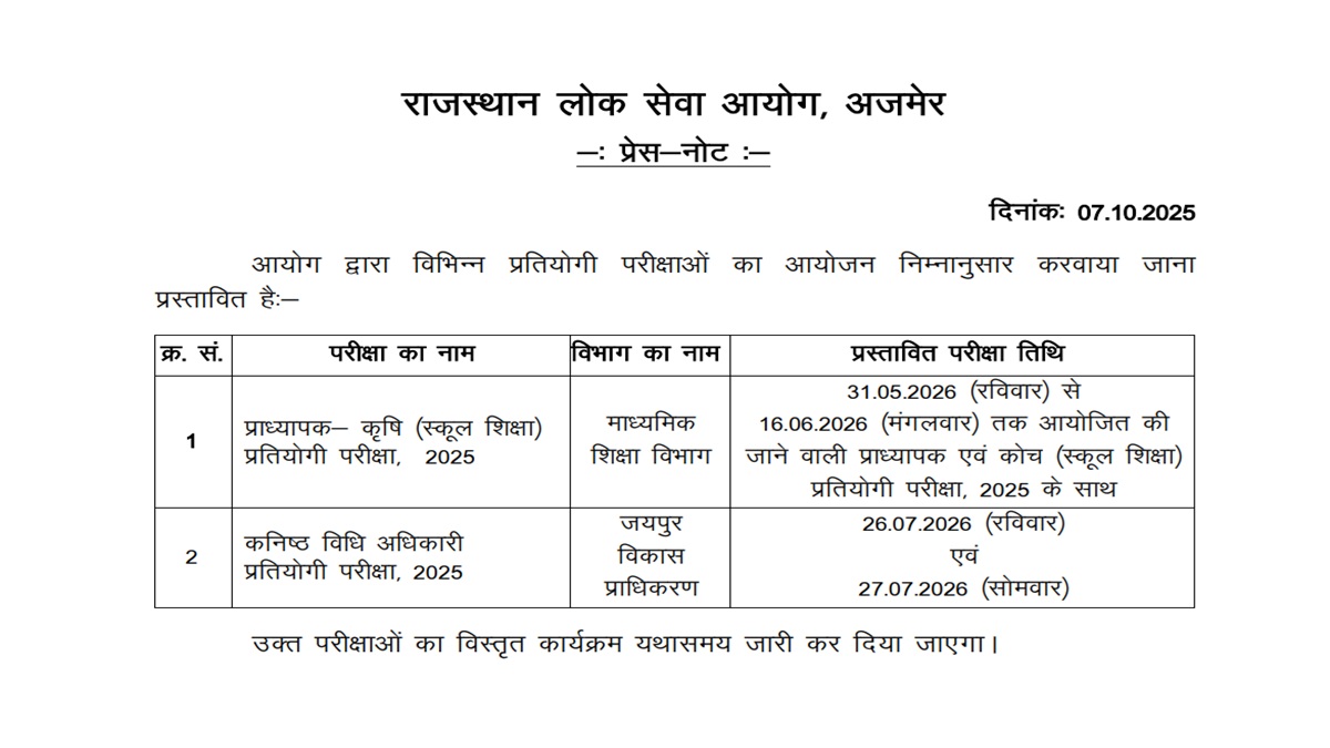 माध्यमिक शिक्षा विभाग के लिए प्राध्यापक कृषि की भर्ती परीक्षा का आयोजन राजस्थान के विभिन्न परीक्षा केंद्रों में 31 मई, 2026 से लेकर 16 जून, 2026 के बीच किया जाएगा। इसके अलावा, जयपुर विकास प्राधिकरण के लिए कनिष्ठ विधि अधिकारी परीक्षा का आयोजन 26 व 27 जुलाई, 2025 के बीच किया जाएगा।