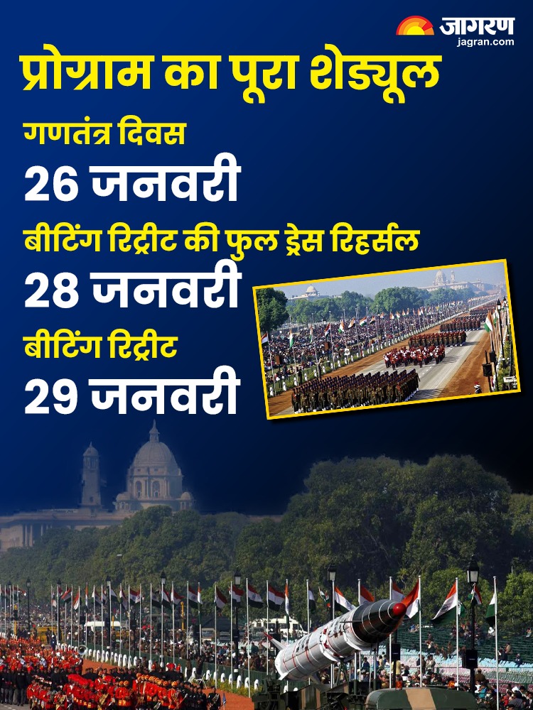 गणतंत्र दिवस परेड का आयोजन राजधानी दिल्ली में कर्तव्य पथ पर 26 जनवरी को किया जाएगा। इसके साथ ही बीटिंग रिट्रीट की फुल ड्रेस रिहर्सल प्रोग्राम 28 जनवरी और बीटिंग रिट्रीट प्रोग्राम का आयोजन 29 जनवरी को किया जाएगा।