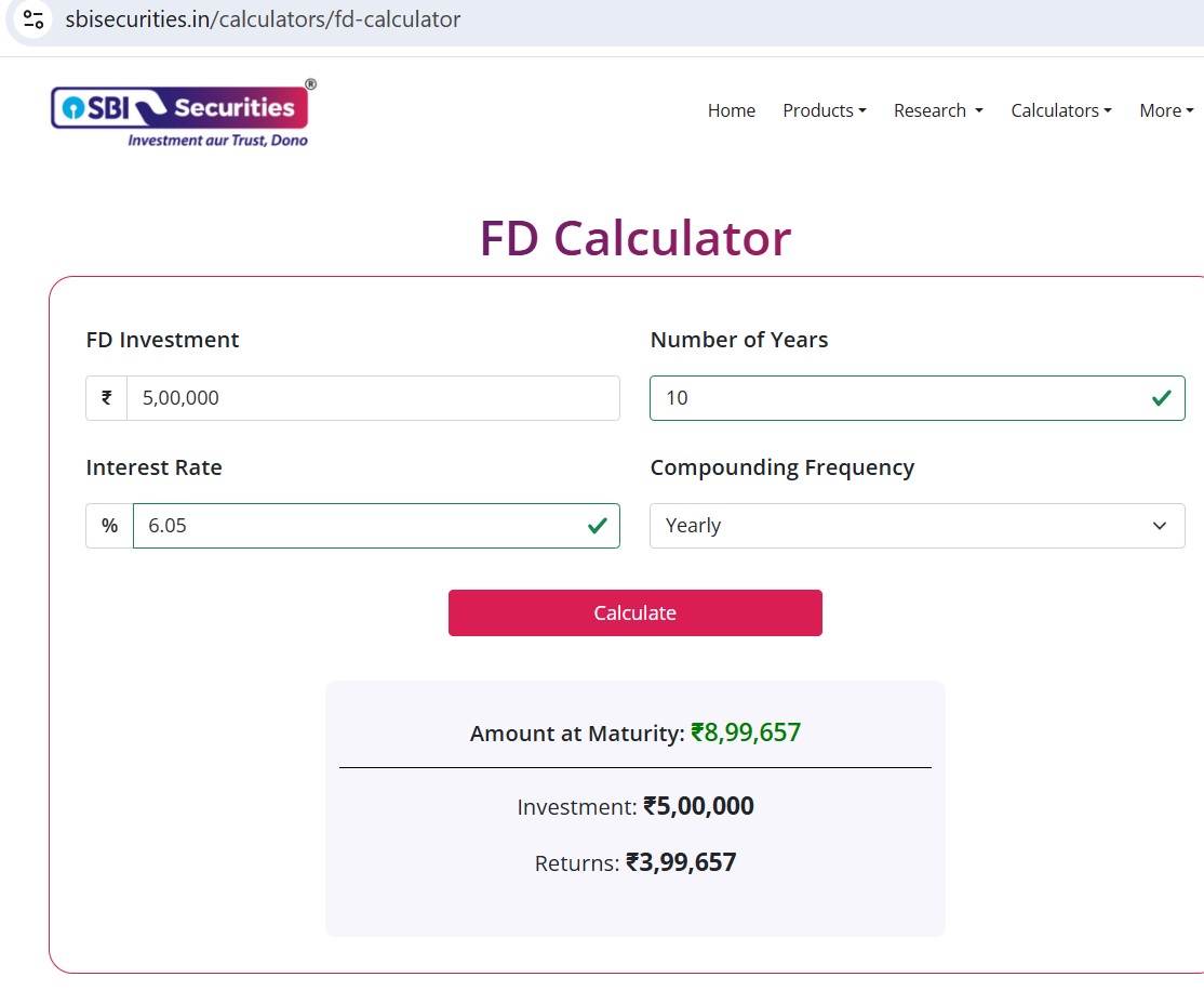 अगर इस पर हम 5 लाख रुपये को 10 साल के लिए निवेश करते हैं तो आपको कितना रिटर्न मिलेगा आइए जानते हैं। हमने SBI Bank के FD Calculator से ही इसे कैलकुलेट किया है।