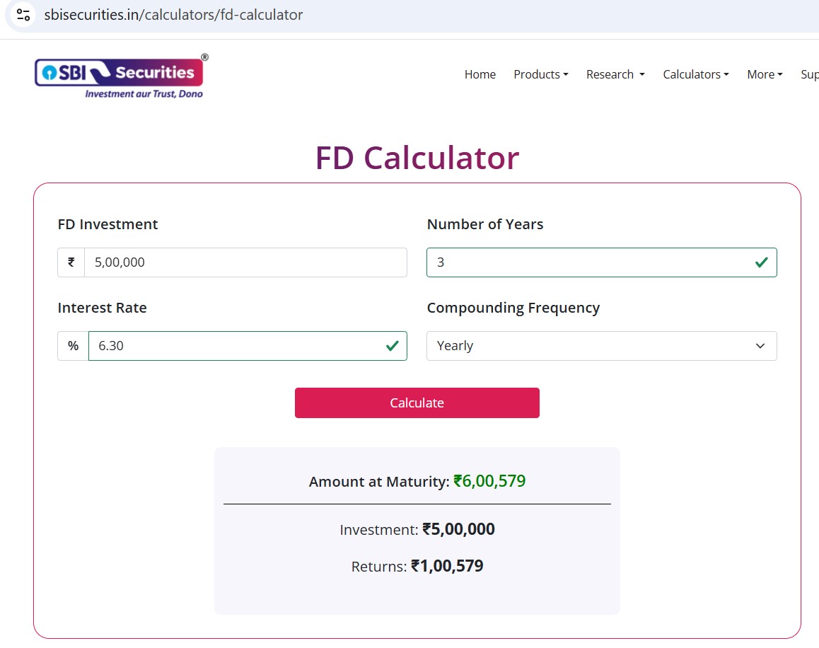 वहीं, अगर आप 3 साल के लिए निवेश करते हैं तो तीन साल के लिए SBI FD पर 6.30 का रिटर्न मिलता है। अगर 3 साल के लिए आप 5 लाख रुपये का नाम का निवेश करते हैं तो आपका 5 लाख रुपये 3 साल बाद आपको  ₹6,00,579 मिलेगा। इसमें ₹1,00,579 ब्याज और 5 लाख मूलधन है।