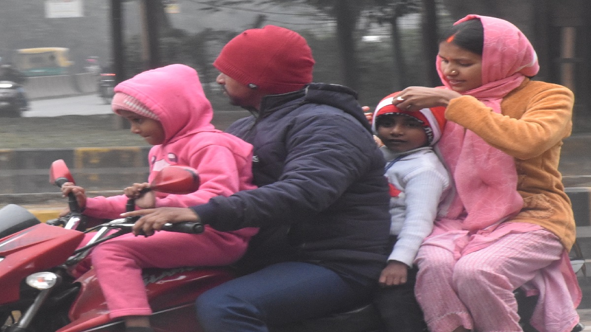 गर्म कपड़े पहनकर परिवार संग सड़क से गुजरता एक परिवार।