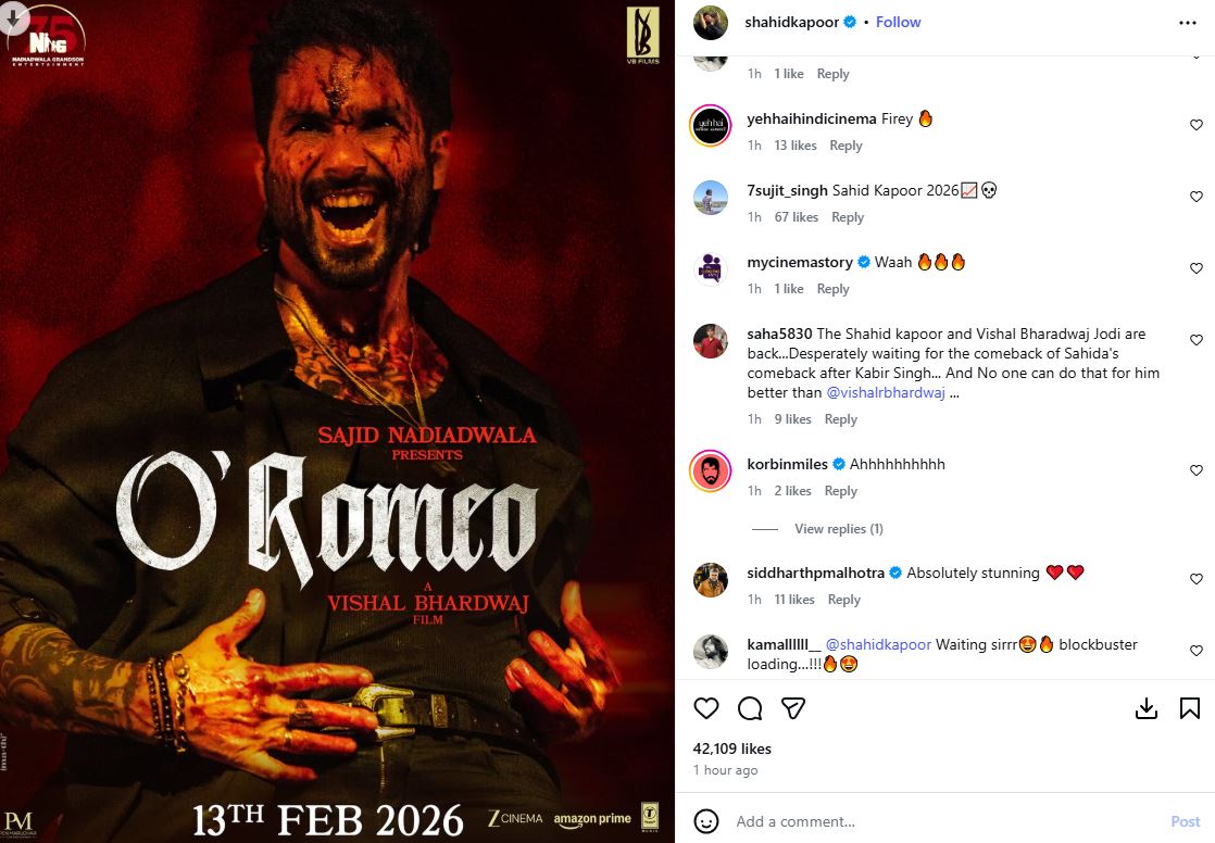 शाहिद कपूर की 2026 की मोस्ट अवेटेड फिल्म \“ओ रोमियो\“ का पहला पोस्टर देख फैंस काफी उत्सुक हो गए हैं। एक यूजर ने लिखा, “मुझे कहीं न कहीं ये महसूस होता था कि ये इंसान एक दिन सबको हैरान कर देगा। इनमें कितना टैलेंट है, इस फिल्म का इंतजार रहेगा।“