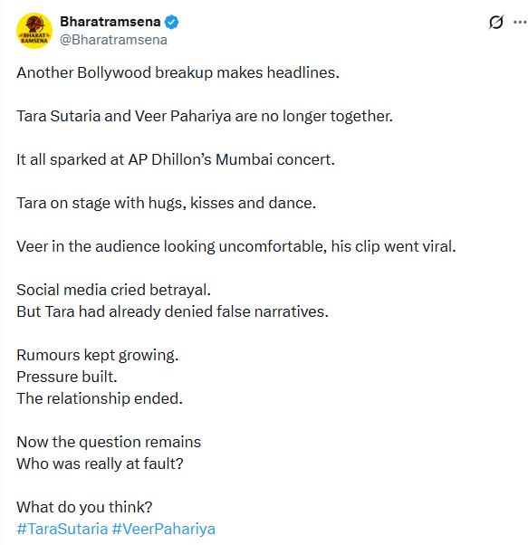दरअसल, जब ये कॉन्सर्ट चल रहा था, तो उस दौरान तारा-एपी की स्टेज पर क्लोजनेस को लेकर काफी ट्रोल किया गया था। अब कई यूजर्स को ऐसा लग रहा है कि कहीं इस कॉन्सर्ट की वजह से ही तो दोनों का ब्रेकअप नहीं हुआ है। एक यूजर ने लिखा, “रूमर्स बढ़ते ही जा रहे हैं, प्रेशर बिल्ड हो रहा है, रिलेशनशिप खत्म।“
