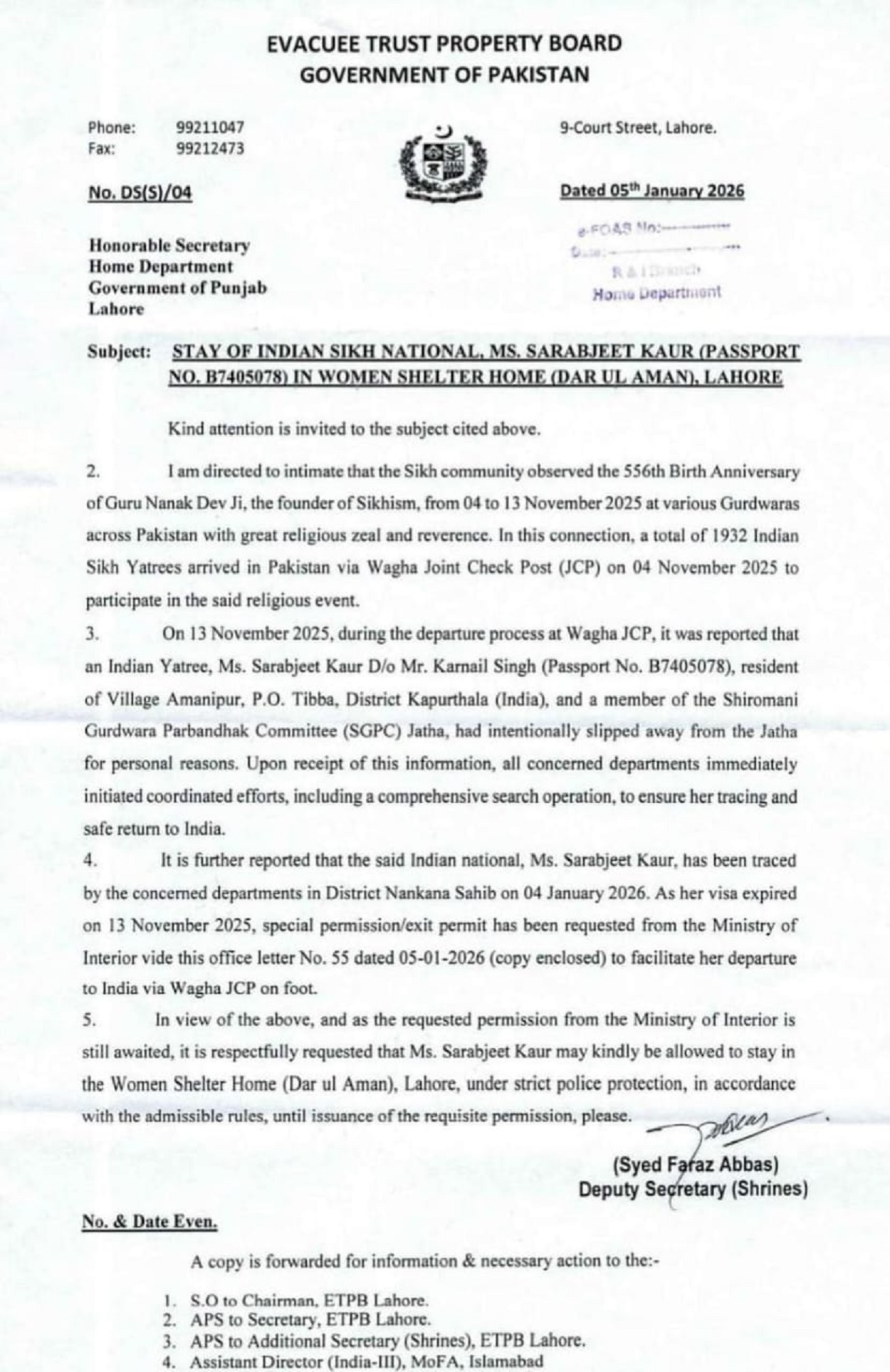 सरबजीत कौर को लाहौर के शेल्टर होम में शिफ्ट किए जाने का आदेश।