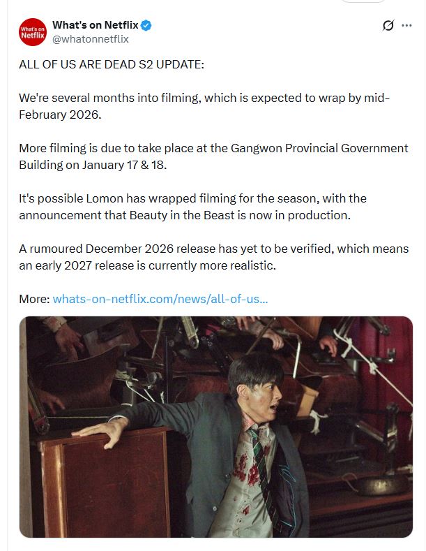 नेटफ्लिक्स की रिपोर्ट्स के मुताबिक, ऑल ऑफ अस आर डेड 2 की शूटिंग काफी महीनों से चल रही है। हालांकि, फरवरी 2026 तक इस हॉरर सीरीज की शूटिंग पूरी खत्म होने की उम्मीद की जा रही है। एक तरफ जहां फैंस शिद्दत से फैंस इस कोरियन ड्रामा सीरीज का इंतजार कर रहे हैं, तो वहीं रिपोर्ट्स की मानें तो, अगले हफ्ते 17 और 18 जनवरी को गंगवॉन प्रांतीय सरकारी स्कूल में सीरीज की आगे की शूटिंग की जाएगी।
