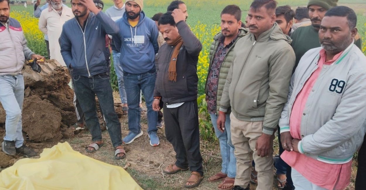 गोवंशी का कटा शव मिलने के बाद मौके पर मौजूद ग्रामीण व हिंदू संगठन के कार्यकर्ता। जागरण