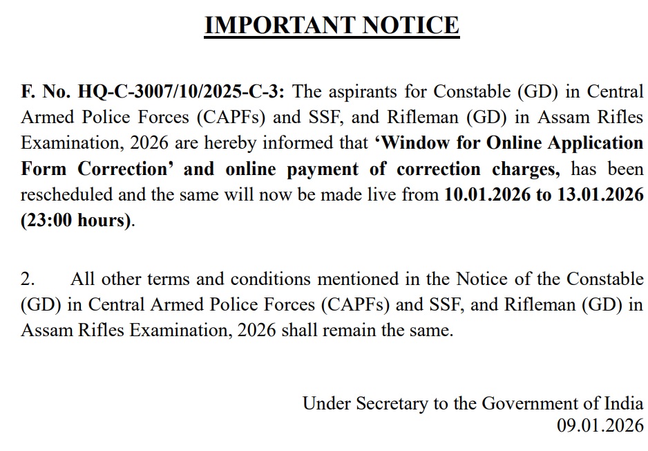 एजुकेशन डेस्क, नई दिल्ली। स्टाफ सिलेक्शन कमीशन (SSC) की ओर से कॉन्स्टेबल जीडी भर्ती 2026 के लिए करेक्शन विंडो ओपन कर दी गई है। जिन अभ्यर्थियों ने इस भर्ती में शामिल होने के लिए आवेदन किया था और फॉर्म भरते समय गलती हो गई थी वे अब फॉर्म में सुधार कर सकते हैं। करेक्शन विंडो कल यानी 13 जनवरी 2026 तक खुली रहेगी। अभ्यर्थी फॉर्म में सुधार एसएससी की ऑफिशियल वेबसाइट ssc.gov.in पर लॉग इन डिटेल दर्ज करके कर सकते हैं।