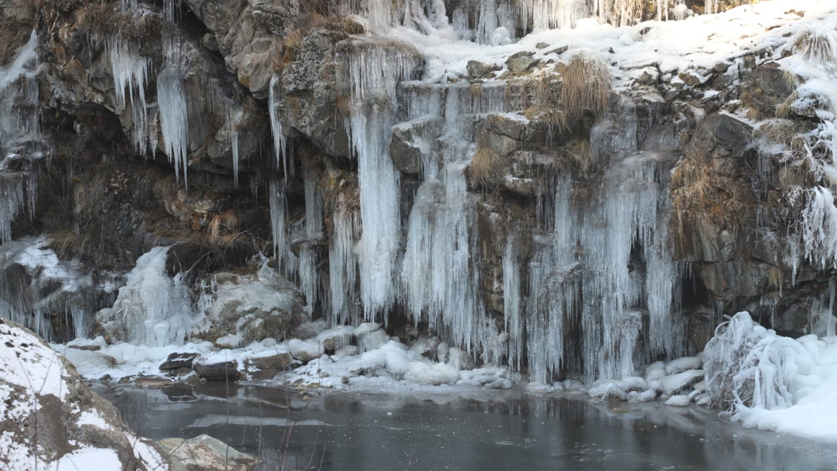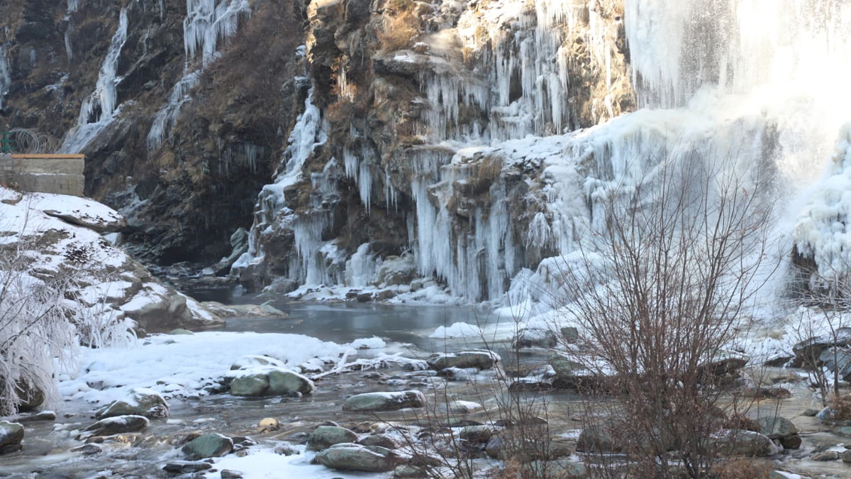 यह जमा हुआ पानी का झरना पर्यटकों के लिए एक प्रमुख आकर्षण बन गया है। फोटो: साहिल मीर