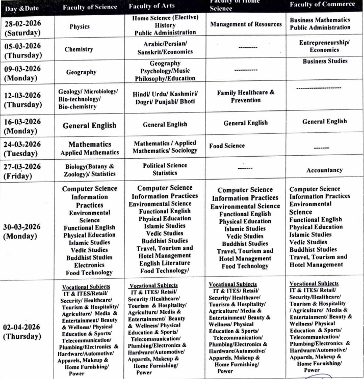 | एग्जाम डेट | साइंस फैकल्टी | आर्ट्स फैकल्टी | होम साइंस फैकल्टी | कॉमर्स फैकल्टी | | 28 फरवरी 2026 | फिजिक्स | गृह विज्ञान (ऐच्छिक विषय), इतिहास, लोक प्रशासन | संसाधनों का प्रबंधन | व्यावसायिक गणित, लोक प्रशासन | | 5 मार्च 2026 | केमिस्ट्री | अरबी/ पेनियन/ संस्कृत/ अर्थशास्त्र | ---- | उद्यमिता/ अर्थशास्त्र | | 9 मार्च 2026 | भूगोल | भूगोल, मनोविज्ञान/ संगीत दर्शनशास्त्र/ शिक्षा | ---- | बिजनेस स्टडीज | | 12 मार्च 2026 | भूविज्ञान/सूक्ष्मजीवविज्ञान/ जैवप्रौद्योगिकी/ जैवरसायन विज्ञान | हिंदी/ उर्दू/कश्मीरी/ डोगरल/ पंजाबी/ भोटल | पारिवारिक स्वास्थ्य देखभाल और रोकथाम | ---- | | 16 मार्च 2026 | जनरल इंग्लिश | जनरल इंग्लिश | जनरल इंग्लिश | जनरल इंग्लिश | | 24 मार्च 2026 | गणित, अनुप्रयुक्त गणित | गणित/ अनुप्रयुक्त गणित/ समाजशास्त्र | फूड साइंस | ---- | | 27 मार्च 2026 | जीवविज्ञान (वनस्पति विज्ञान और प्राणी विज्ञान)/ सांख्यिकी | राजनीति विज्ञान, सांख्यिकी | ---- | अकाउंटेंसी | | 30 मार्च 2026 | कंप्यूटर विज्ञान, सूचना, प्रथाएं, पर्यावरण विज्ञान, कार्यात्मक अंग्रेजी, शारीरिक शिक्षा, इस्लामी अध्ययन, वैदिक अध्ययन, बौद्ध अध्ययन, इलेक्ट्रॉनिक्स, खाद्य प्रौद्योगिकी | कंप्यूटर विज्ञान, सूचना अभ्यास, पर्यावरण विज्ञान, कार्यात्मक अंग्रेजी, शारीरिक शिक्षा, इस्लामी अध्ययन, वैदिक अध्ययन, बौद्ध अध्ययन यात्रा, पर्यटन और होटल प्रबंधन, अंग्रेजी साहित्य, खाद्य प्रौद्योगिकी | कंप्यूटर विज्ञान, सूचना अभ्यास, पर्यावरण विज्ञान, कार्यात्मक अंग्रेजी, शारीरिक शिक्षा, इस्लामी अध्ययन, वैदिक अध्ययन, बौद्ध अध्ययन, यात्रा, पर्यटन और होटल प्रबंधन, खाद्य प्रौद्योगिकी |