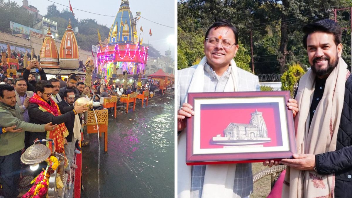 मुख्यमंत्री पुष्कर सिंह धामी ने सांसद अनुराग ठाकुर से मुलाकात के दौरान उन्हें श्री केदारनाथ का चित्र भेंट किया। वहीं, गंगा आरती करते सांसद अनुराग ठाकुर। जागरण