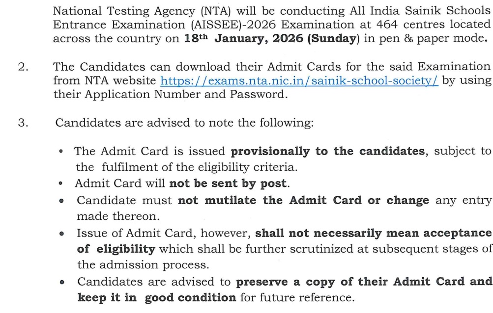 एजुकेशन डेस्क, नई दिल्ली। नेशनल टेस्टिंग एजेंसी (NTA) की ओर से ऑल इंडिया सैनिक स्कूल एंट्रेस एग्जाम (AISSEE 2026) के लिए एडमिट कार्ड जारी कर दिए गए हैं। सैनिक स्कूल कक्षा 6 एवं 9 प्रवेश परीक्षा के लिए आवेदन करने वाले स्टूडेंट्स या उनके माता पिता तुरंत ही हॉल टिकट (AISSEE Hall Ticket 2026) ऑनलाइन माध्यम से एनटीए की ऑफिशियल वेबसाइट exams.nta.nic.in पर जाकर डाउनलोड कर सकते हैं। इसके अलावा आप इस पेज पर उपलब्ध करवाए गए डायरेक्ट लिंक पर क्लिक करके भी प्रवेश पत्र डाउनलोड कर सकते हैं।