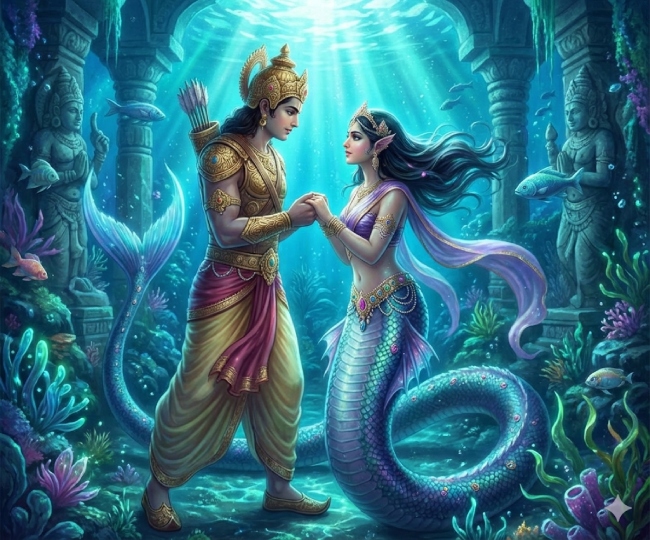 इसी दौरान उसकी मुलाकात उलूपी से हुई और वह अर्जुन पर मोहित हो गई थी। उलूपी असल में एक जलपरी नागकन्या थी। उसने उन्होंने अर्जुन के समक्ष विवाह का प्रस्ताव रखा। अर्जुन ने नागकन्या उलूपी को अपनी भार्या रूप में स्वीकार किया और एक साल तक उसके साथ रहने के बाद अपने राज्य वापस लौट आए।