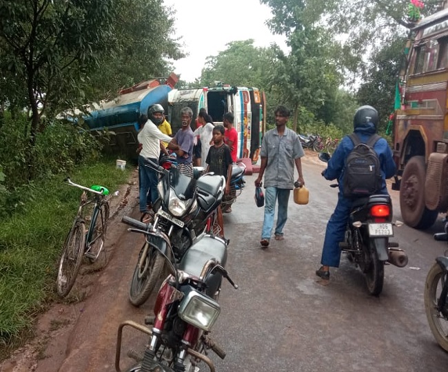 हाटगम्हरिया में टैंकर पलटा, खेतों में बहा हजारों लीटर डीजल