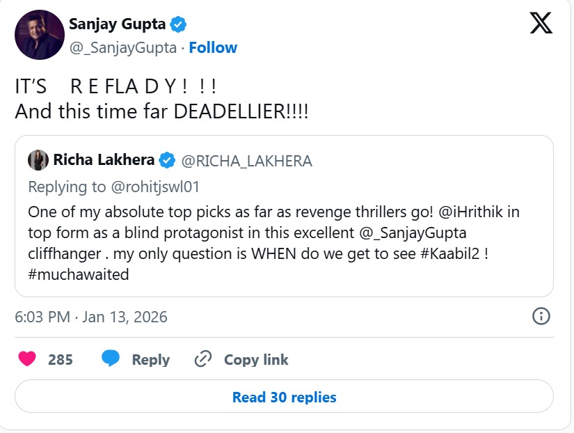 फैन ने संजय से सवाल करते हुए पोस्ट किया,\“बदले की थ्रिलर फिल्मों में से मेरी सबसे पसंदीदा फिल्म! संजय गुप्ता की इस शानदार फिल्म में Hrithik ने एक अंधे हीरो के रूप में बेहतरीन अभिनय किया है। मेरा बस एक ही सवाल है कि #Kaabil2 कब देखने को मिलेगी! #बेहदइंतजार”।