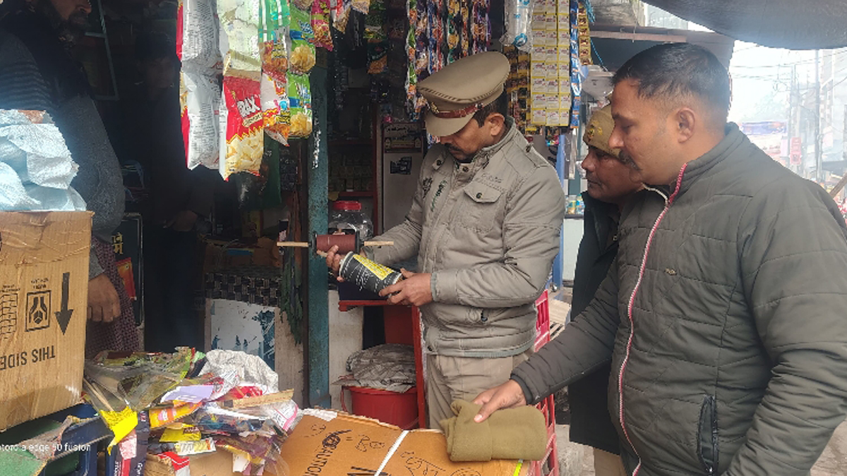 दुकानों पर जांच करते पुलिस अधिकारी